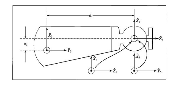 - 当前关节与上一个关节 z 轴异位(既不平行也不相交)。选择公垂线与当前轴的交点作为坐标系原点。