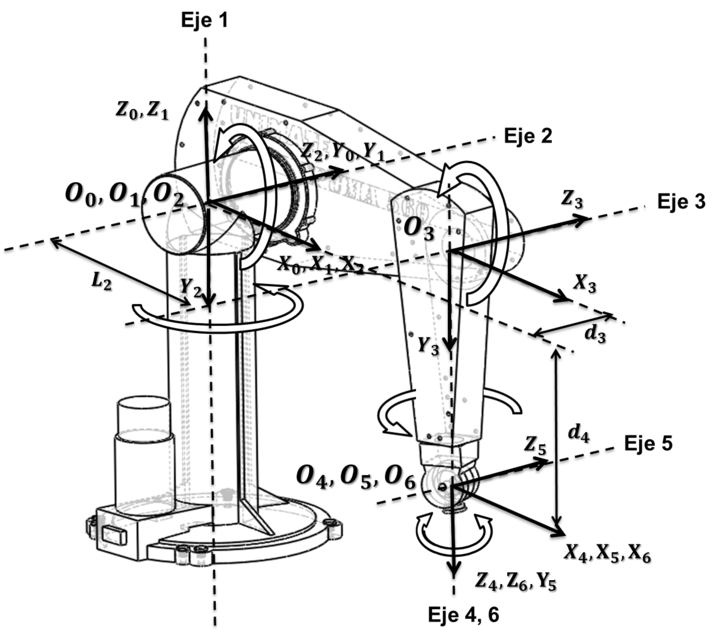 - 选择当前关节与上一个关节z 轴平行,常选择上一轴的投影或连杆长度起点,以保证 DH 参数唯一性;
